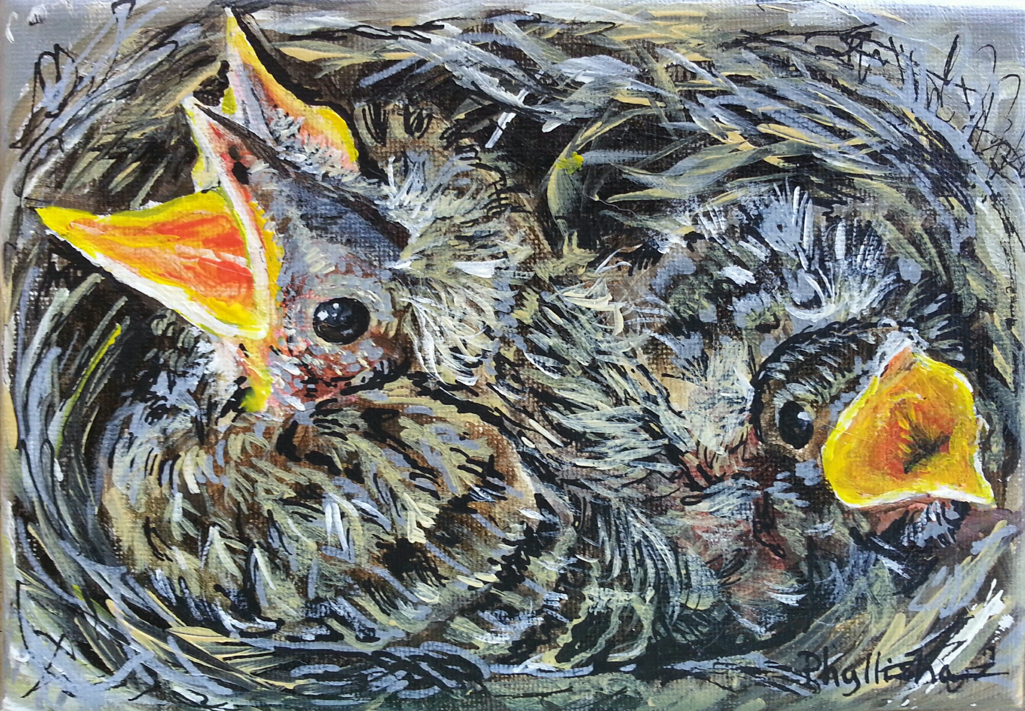 5″x7″, acrylic. I love to watch and paint baby birds. When I used to have my wildlife rehabilitators permit I often received and cared for baby robins. They grow up fast and are quick learners; put that wiggly worm in a dish and they’re on it!