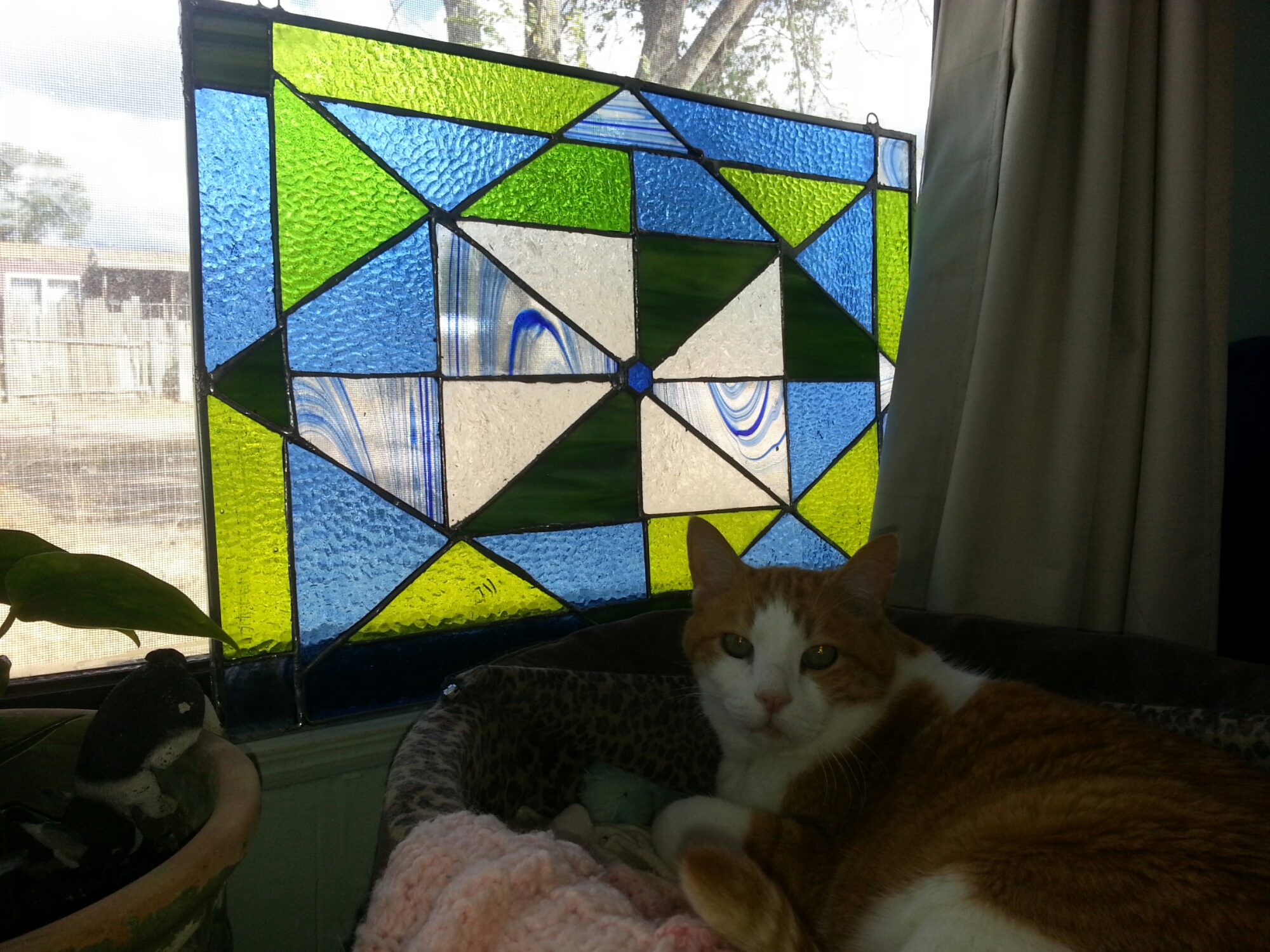Stained glass window with cat. October 18, 2015phyllishafineart 2 Comments My first stained glass window, 24″×17″, glass and metal. It was so much fun to make! I want to do more! Share this with anyone interested. Click to share on X (Opens in new window) X Click to share on Facebook (Opens in new window) Facebook Click to share on Pinterest (Opens in new window) Pinterest Click to share on LinkedIn (Opens in new window) LinkedIn Click to email a link to a friend (Opens in new window) Email Click to print (Opens in new window) Print Click to share on Tumblr (Opens in new window) Tumblr Click to share on Pocket (Opens in new window) Pocket Click to share on Reddit (Opens in new window) Reddit Like Loading... Related
