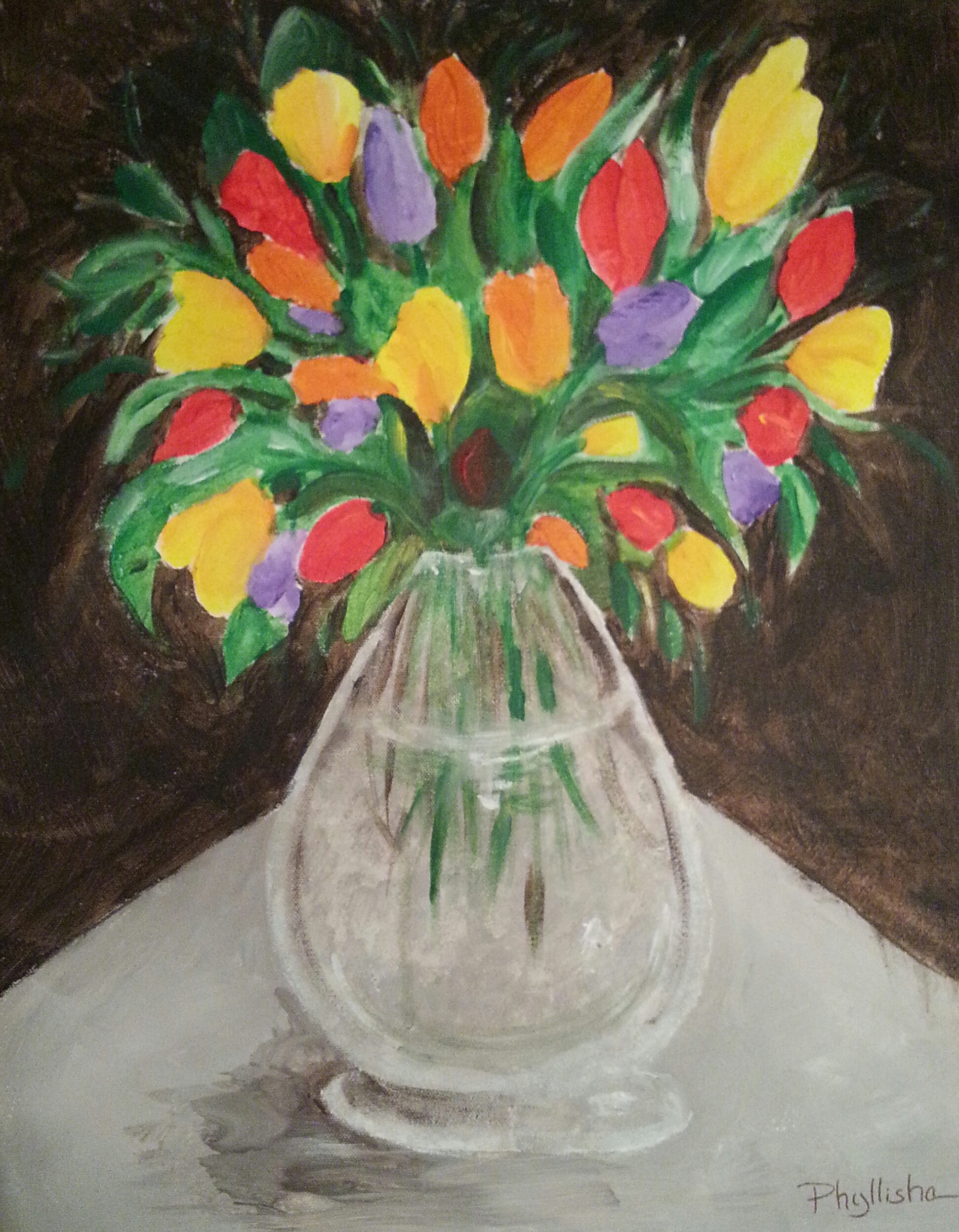 16″×20″, acrylic. A really big painting for me and I struggle with the acrylic medium, unlike the last vase of flowers I did in pastel. But it was a lot of fun! Notice this composition is of the Western aesthetic; everything is front and center. So I put a little dark red tulip surrounded by a heart shaped leaf right smack dab in the middle! Btw this is my dog and her name is Lily. I will paint her soon as well.