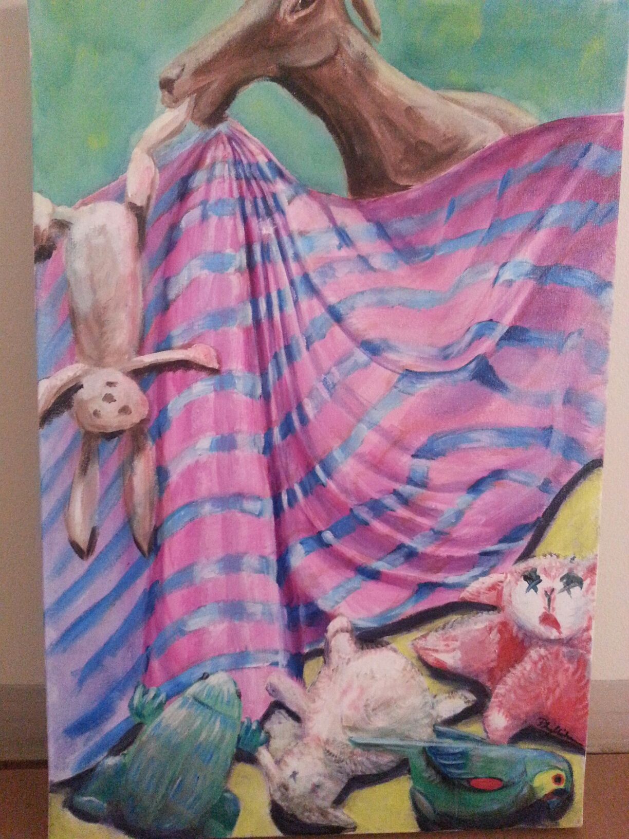 This painting is 24″x36″, acrylic. About the largest size I’ve ever done. It was just juried into the Santa Fe Community College’s annual show of student work. The curtains I painted from real life. The rest is from my imagination. It was fun to do…