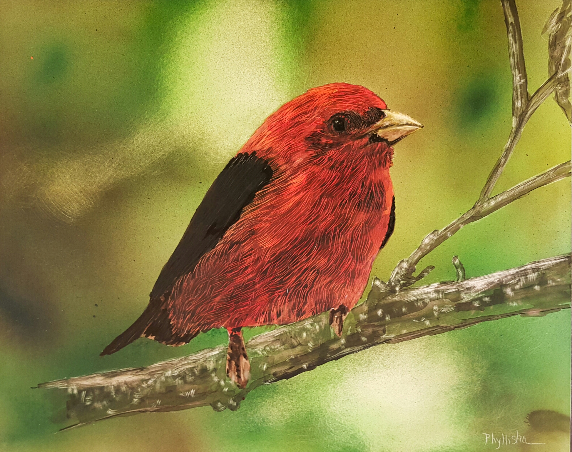 100% scratchboard, 8″x10″, airbrushed background using air brush I borrowed. Now I want to buy one because I like the effect rather then an all black background like traditional scratch boards. And all scratch board inks on clay board. Love these birds. Have seen a few on my birding excursions.
