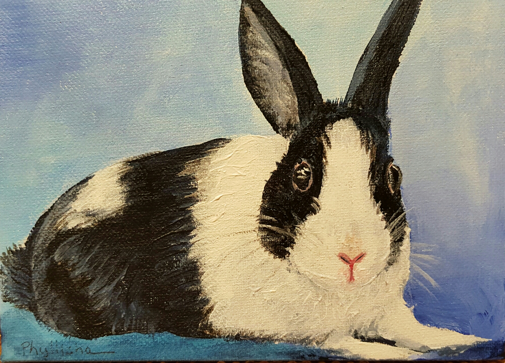 Black and White Bunny February 27, 2017phyllishafineart Leave a comment Black and White Bunny, 5″×7″, acrylic. I’m getting tired of painting bunnies although they are just the cutest! I’m going to paint squirrels now…will return to bunnies later…. Share this with anyone interested. Click to share on X (Opens in new window) X Click to share on Facebook (Opens in new window) Facebook Click to share on Pinterest (Opens in new window) Pinterest Click to share on LinkedIn (Opens in new window) LinkedIn Click to email a link to a friend (Opens in new window) Email Click to print (Opens in new window) Print Click to share on Tumblr (Opens in new window) Tumblr Click to share on Pocket (Opens in new window) Pocket Click to share on Reddit (Opens in new window) Reddit Like Loading... Related