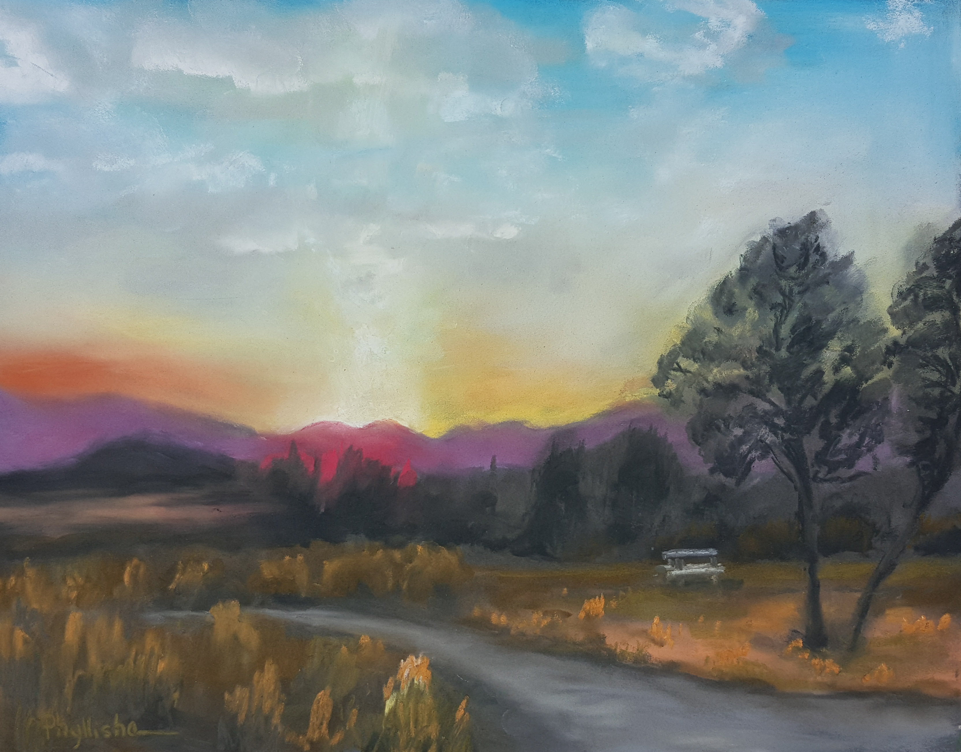 Sunrise at Aguaje Campground June 23, 2017phyllishafineart Leave a comment Here plein air painting at the Wild Rivers Paint Out and awoke to this beautiful scene so had to paint it! 11″×14″, pastel. Share this with anyone interested. Click to share on X (Opens in new window) X Click to share on Facebook (Opens in new window) Facebook Click to share on Pinterest (Opens in new window) Pinterest Click to share on LinkedIn (Opens in new window) LinkedIn Click to email a link to a friend (Opens in new window) Email Click to print (Opens in new window) Print Click to share on Tumblr (Opens in new window) Tumblr Click to share on Pocket (Opens in new window) Pocket Click to share on Reddit (Opens in new window) Reddit Like Loading... Related