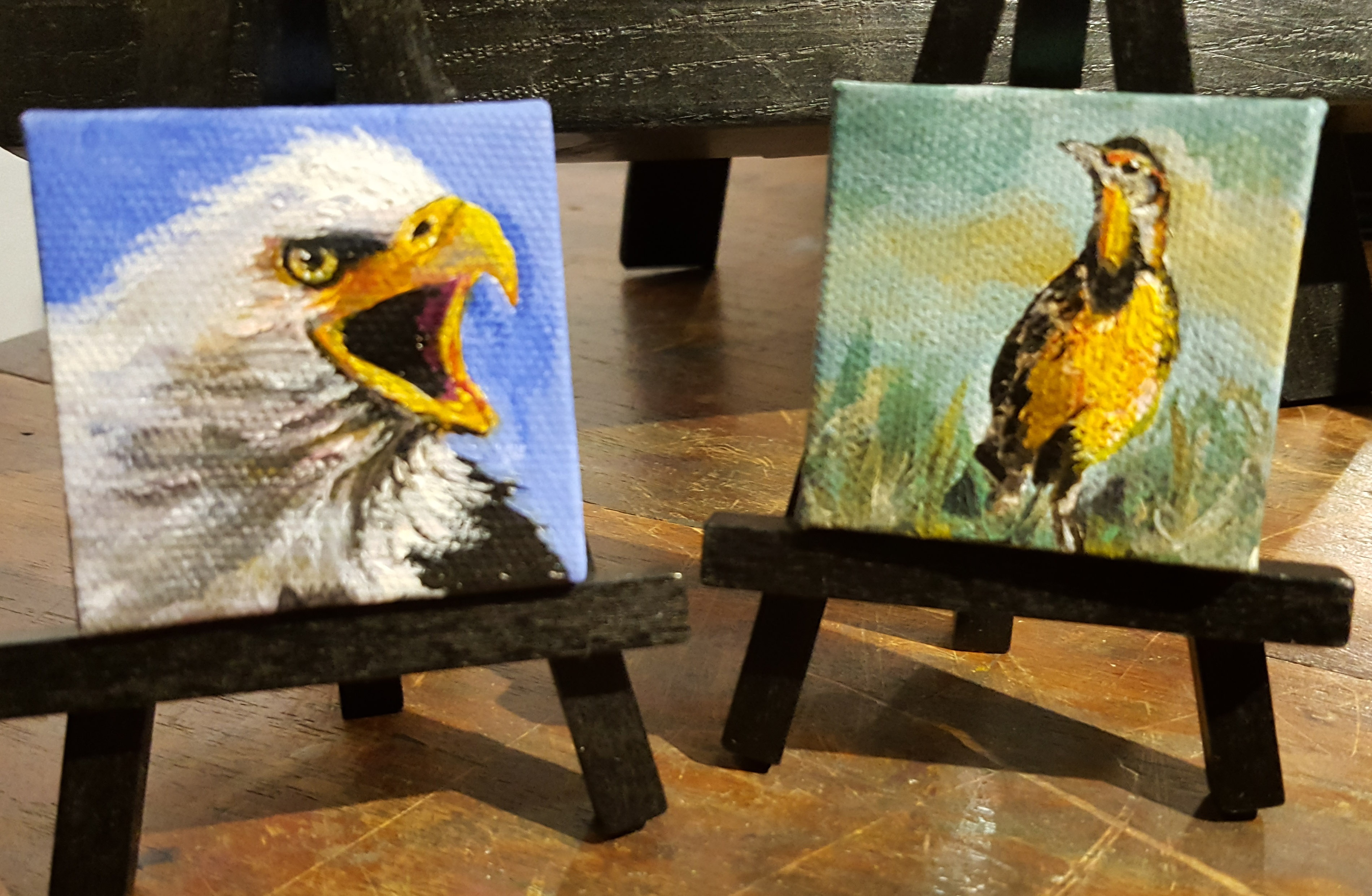 Both 2″×2″, acrylic, Bald Eagle and Western Meadowlark
