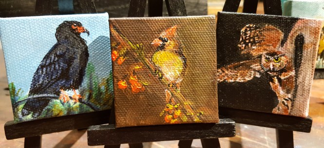 2″×2″, acrylic. Black hawk, Cardinal, Owl
