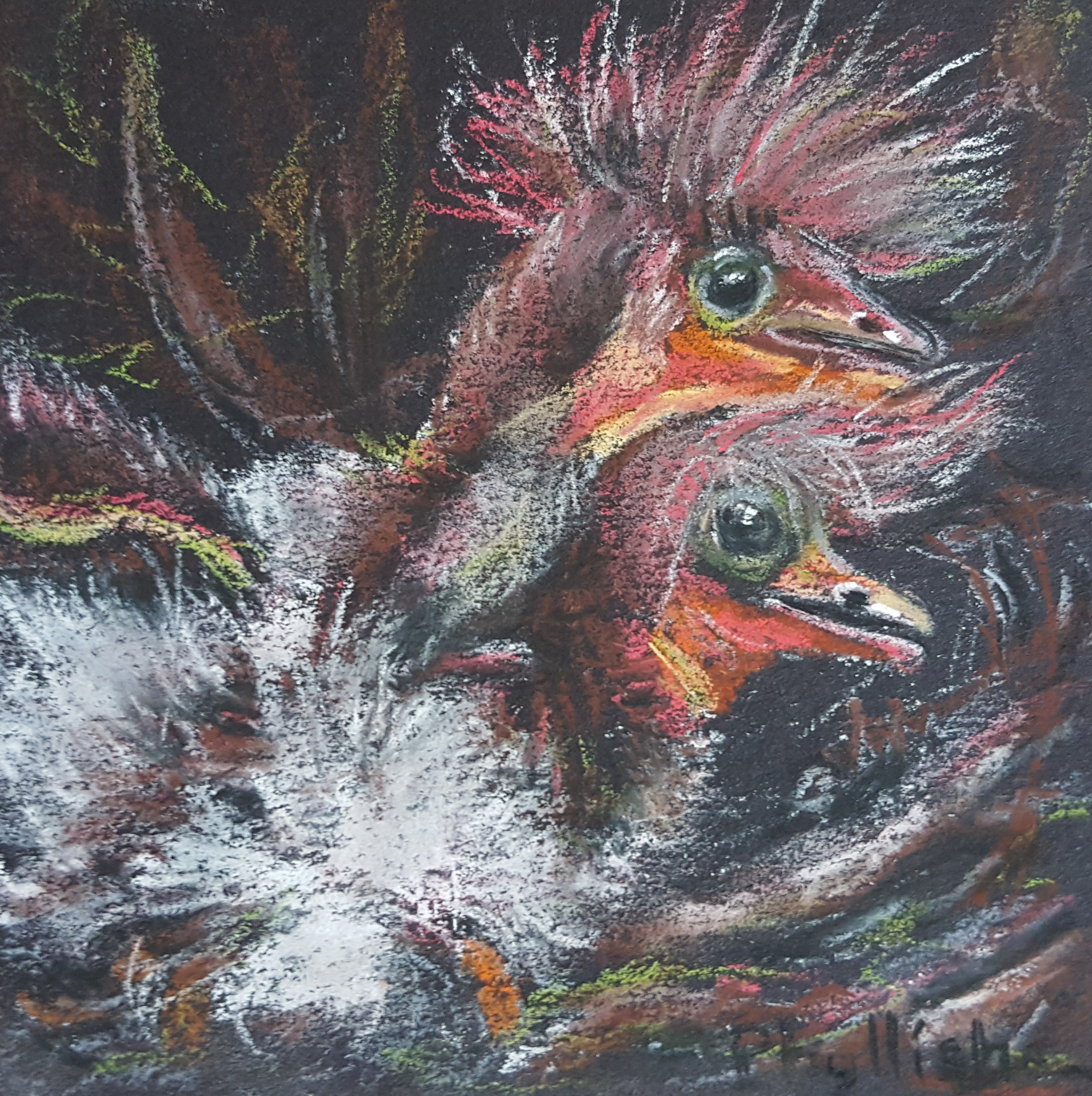 4″×4″, pastel. So ugly they’re cute! I love baby birds. They remind me of little dinosaurs!