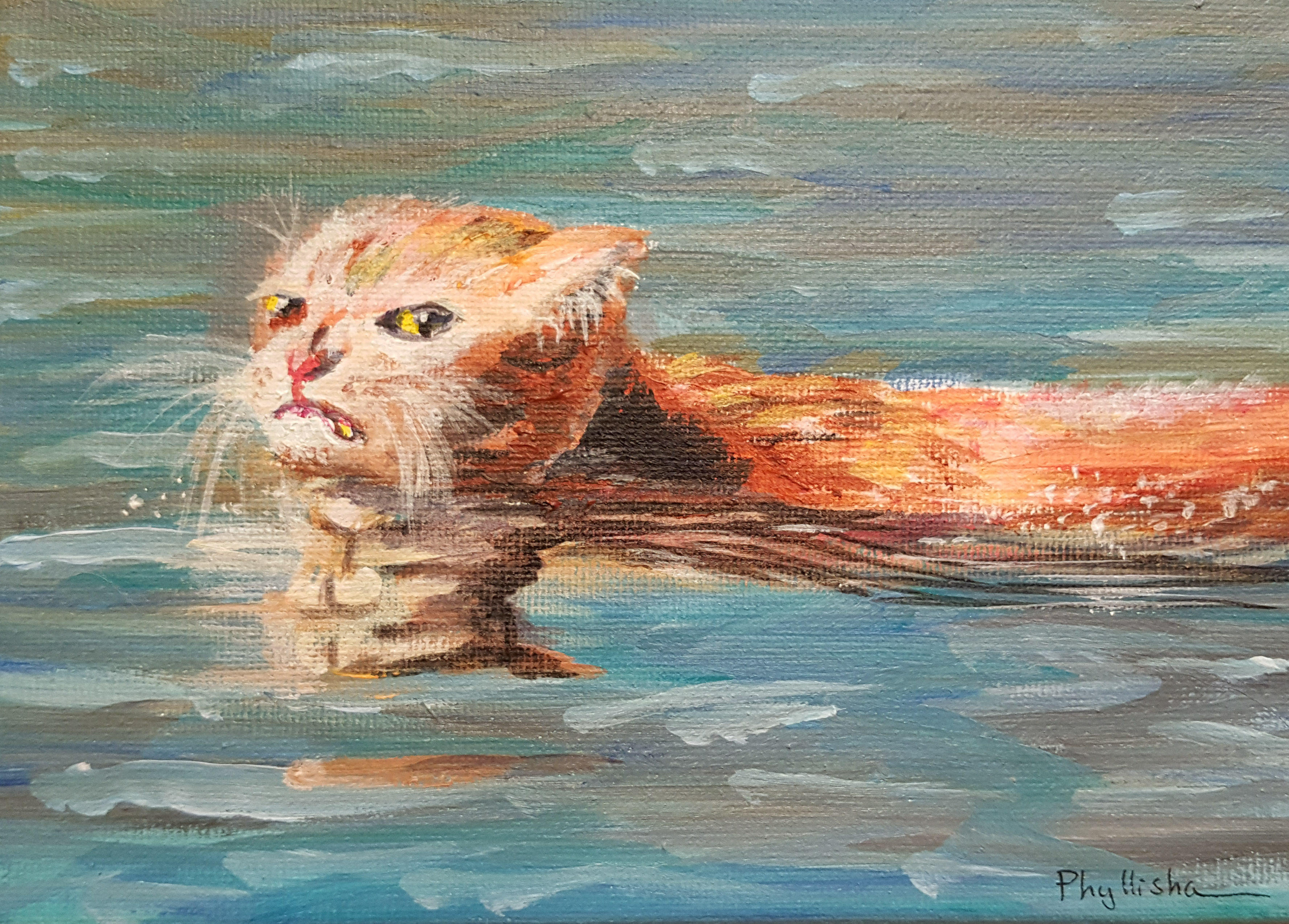 Cat caught out in Hurricane Harvey. 5″×7″, acrylic on canvas. ‘Swimming to Safety”