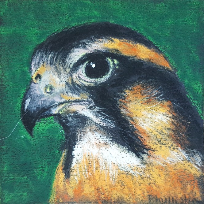Peregrine Falcon, 4″×4″, pastel. Please note, dog hair was removed before framing!
