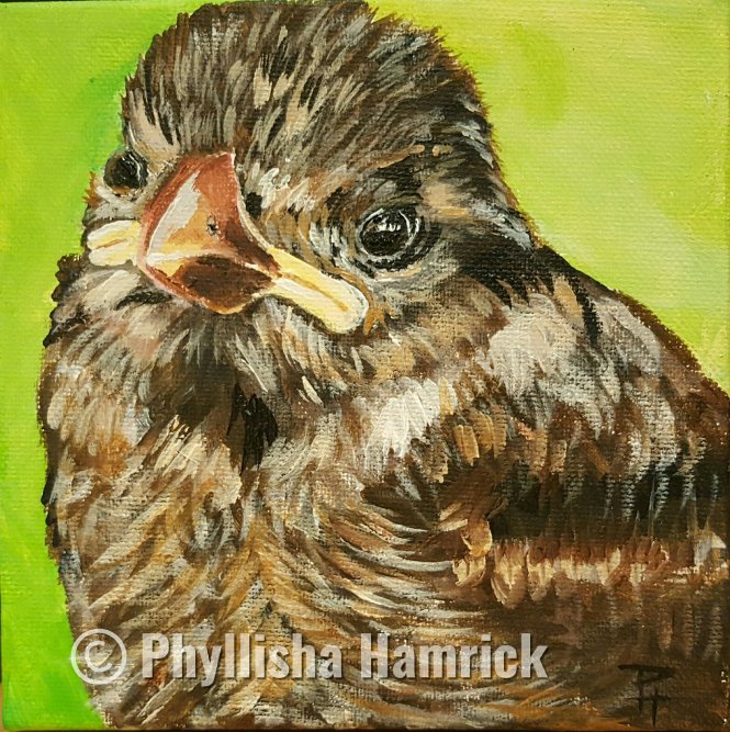 My first rehab patient, when I became a wildlife rehabilitator 30 years ago, was a baby pigeon then a baby house sparrow. I named him Juvenile. So please meet Juvenile! 6″×6″, acrylic on canvas. I know they are ‘bad’ for the ecological system because they are an introduced species but as an individual, they are spunky, adorable and have a ton of personality!