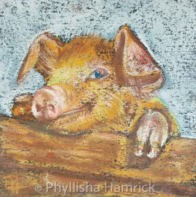 4″×4″, pastel, Baby Pig. I decided today to paint a farm amimal. I would have liked to live on a farm. One time I did for a very brief time. One day my roomates couldn’t find me and eventually found me asleep with the cows. I connect very deeply with animals. When I paint them, I truly enjoy looking and meditating upon them.