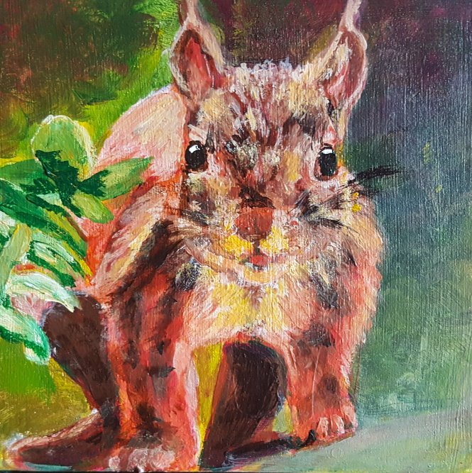 Little Joe, 6″×6″ #acrylicsquirrel on cradled wood panel. This one was a struggle as I’m trying to inject color and depth without being garish. Also, learning the use of painting with matt medium to add depth.