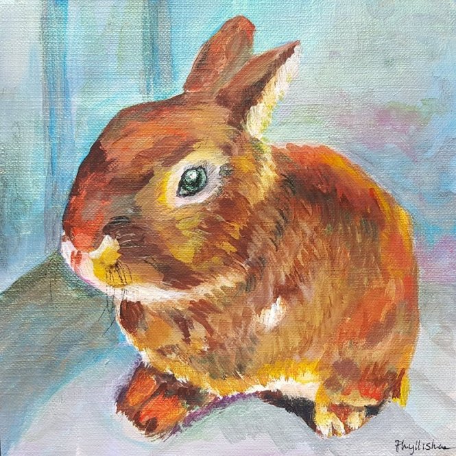 6″×6″, acrylic. And available for adoption at Midwest Rabbit Rescue and Rehome in Plymouth Michigan.