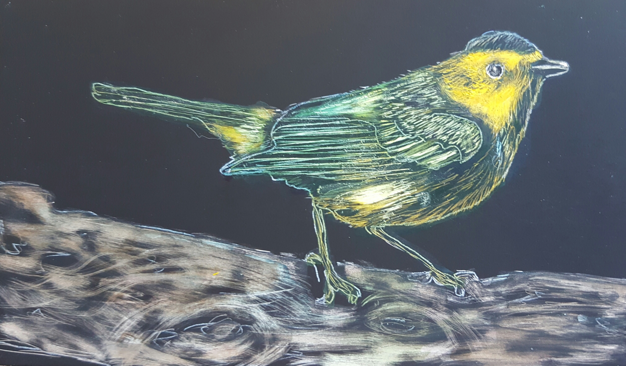 2 3/4″× 4 3/4″, scratchboard with scratchboard inks, Wilson’s Warbler (I think).