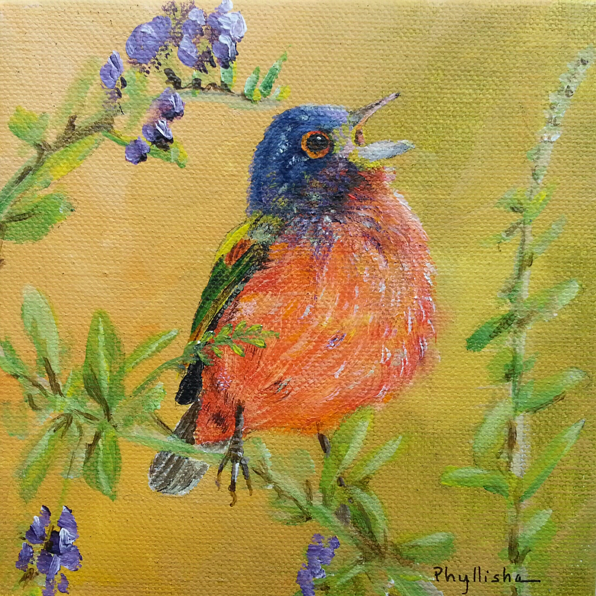 ‘Spring Herald’, painted bunting, 6″×6″, acrylic.